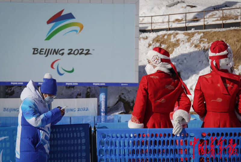 3月3日,北京2022年冬残奥会张家口赛区国家冬季两项中心,颁奖礼仪志愿者在赛道边待命,准备进行颁奖仪式的演练。中青报·中青网记者 李峥苨/摄