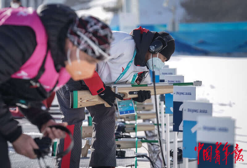3月3日,北京2022年冬残奥会张家口赛区国家冬季两项中心,工作人员佩戴耳机对靶场进行检查。据2022北京冬奥会和冬残奥会官网介绍,不同于冬奥会上50米的射击距离,在残奥冬季两项的比拼中,运动员须击中10m外的射击靶。视力障碍组运动员使用装配有声瞄准系统的电子步枪,运动员通过耳机收听提示音,辨别方位、判断时机进行射击。中青报·中青网记者 李峥苨/摄