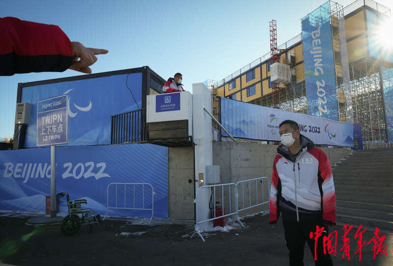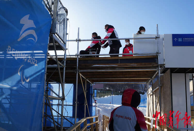 3月1日,北京冬残奥会张家口赛区云顶滑雪公园,工作人员演示如何使用场馆内的无障碍设施。中青报·中青网记者 李峥苨/摄
