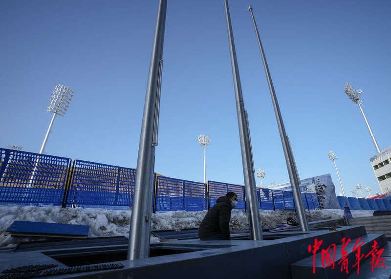 3月3日,北京2022年冬残奥会张家口赛区国家冬季两项中心,终点线旁树起三根旗杆。据工作人员介绍,冬残奥会期间,将会有奖牌颁发仪式在赛场直接举行。中青报·中青网记者 李峥苨/摄
