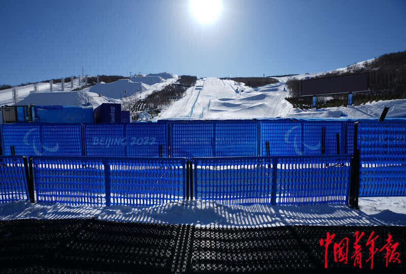3月1日,北京冬残奥会张家口赛区云顶滑雪公园,赛道边的混合采访区内设置了无障碍区域,围栏比其他区域低。中青报·中青网记者 李峥苨/摄