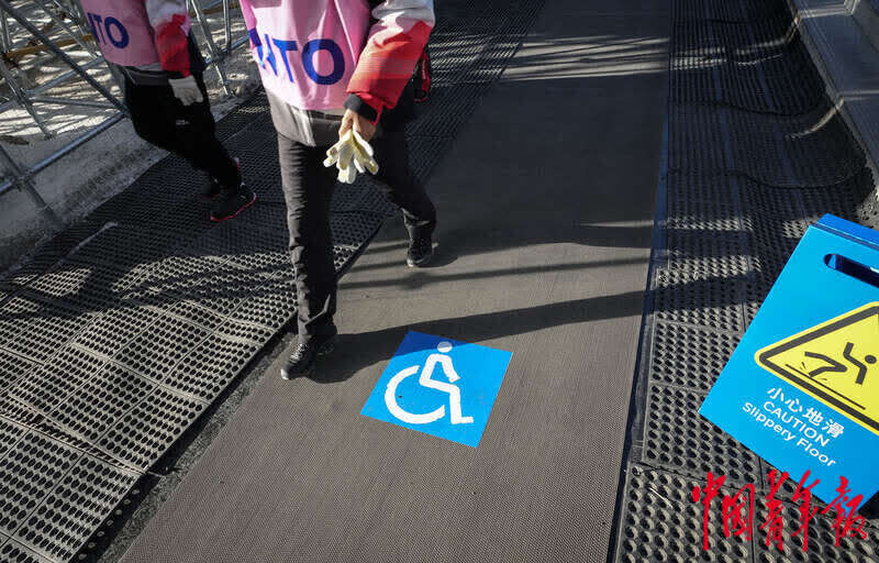 3月3日,北京2022年冬残奥会张家口赛区国家冬季两项中心,道路在有孔的防滑垫之间空出了足够轮椅通过的平整地面,作为无障碍通道。中青报·中青网记者 李峥苨/摄