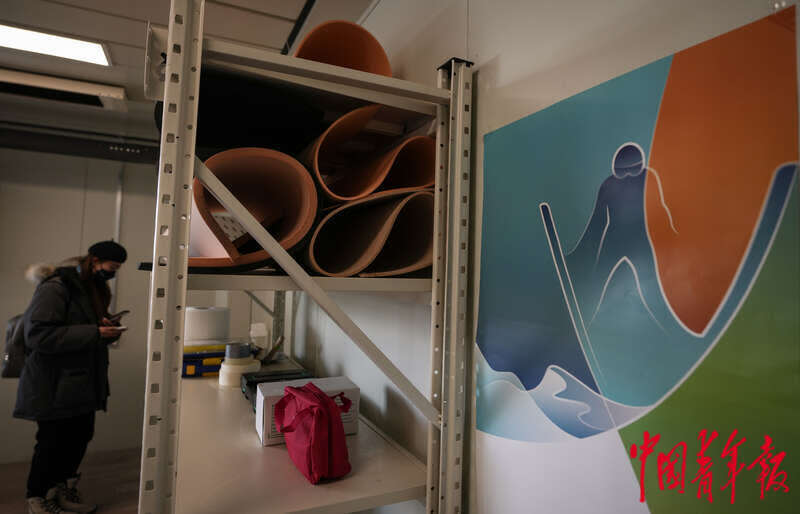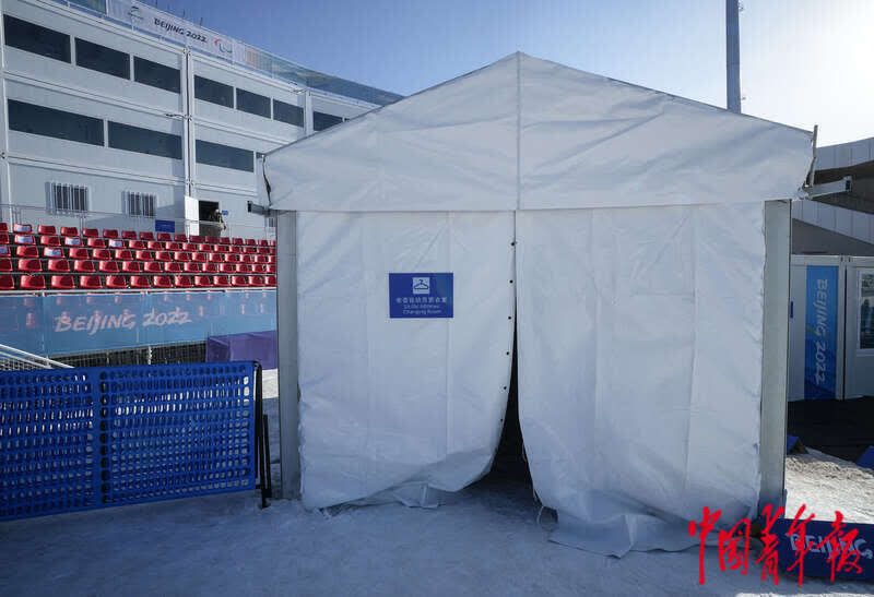 3月3日,北京2022年冬残奥会张家口赛区国家冬季两项中心,坐姿运动员更衣室建在终点线和混合采访区之间。冬残奥会期间,赛场内新设置了轮椅假肢维修间、轮椅存放间、坐姿运动员更衣室等。中青报·中青网记者 李峥苨/摄