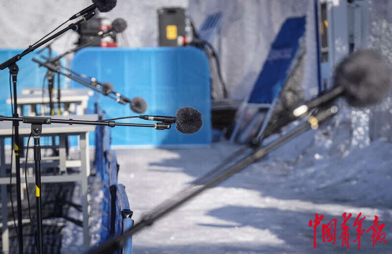 3月3日,北京2022年冬残奥会张家口赛区国家冬季两项中心,混合采访区内,为运动员架设的话筒根据站姿、坐姿运动员的不同需求被设置在不同高度,围栏高度也降低了。中青报·中青网记者 李峥苨/摄