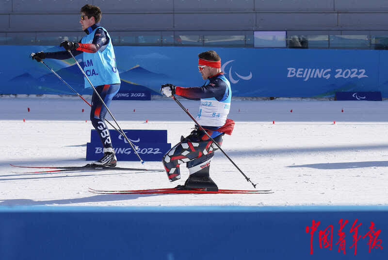 3月3日,北京2022年冬残奥会河北张家口赛区国家冬季两项中心,赛前非官方训练中,一位英国运动员在领滑员的陪伴下滑行,赛道内外都已换上了北京2022年冬残奥会会徽。国家冬季两项中心是北京2022年冬残奥会残奥越野滑雪和残奥冬季两项的比赛场地,共有38枚金牌将在这里产生。北京冬残奥会将于3月4日开幕,张家口赛区各竞赛场馆人员、设施、引导标识、景观形象、无障碍环境等的转换和准备工作接近尾声。中青报·中青网记者 李峥苨/摄