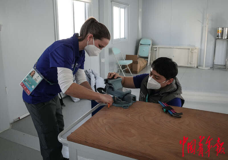 3月3日,北京2022年冬残奥会张家口赛区国家冬季两项中心轮椅假肢维修间内,项目负责人和技师对操作台进行调整,为明天的正式运行做准备。不仅在冬残奥会各竞赛场馆内,冬残奥村里也有专人提供轮椅假肢维修服务。中青报·中青网记者 李峥苨/摄