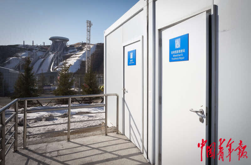 3月3日,北京2022年冬残奥会张家口赛区国家冬季两项中心,轮椅假肢维修间门前。冬残奥会期间,赛场内新设置了轮椅假肢维修间、轮椅存放间、坐姿运动员更衣室等服务保障设施。中青报·中青网记者 李峥苨/摄