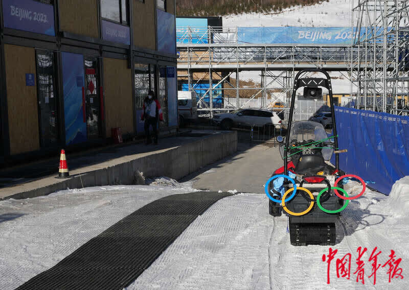 3月1日,北京冬残奥会张家口赛区云顶滑雪公园,工作人员的雪上摩托后绑着奥运五环。中青报·中青网记者 李峥苨/摄