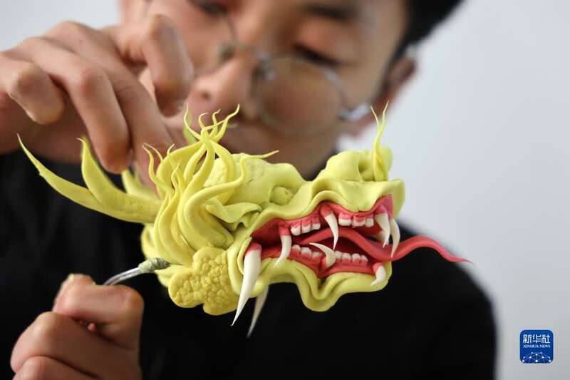 3月3日,山东省滨州市惠民县清河镇的面塑艺人刘增辉在制作春龙面塑作品。