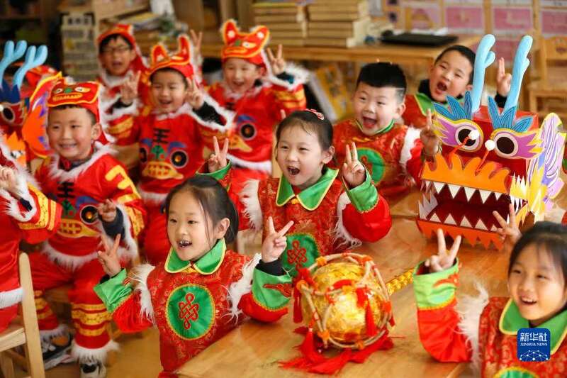 3月3日,山东省青岛市即墨区龙山中心幼儿园的孩子们在进行舞龙表演。