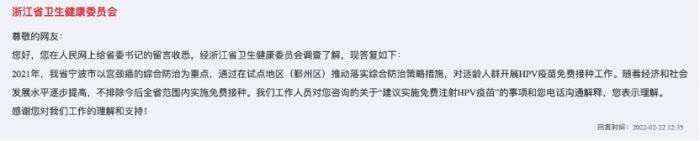 此外,浙江省卫健委日前也在回复网友提问时,表示通过在试点地区(鄞州区)推动落实综合防治策略措施,对适龄人群开展HPV疫苗免费接种工作。随着经济和社会发展水平逐步提高,不排除今后全省范围内实施免费接种。
