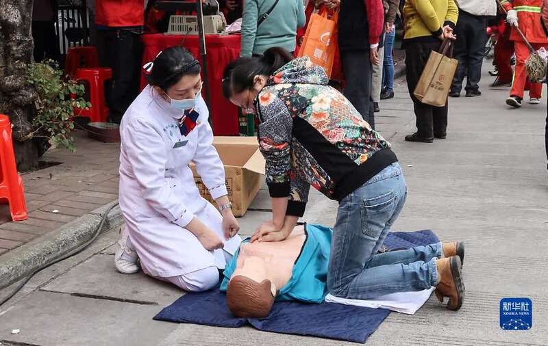 3月4日,志愿者在“雷锋街市”指导市民练习急救技能。