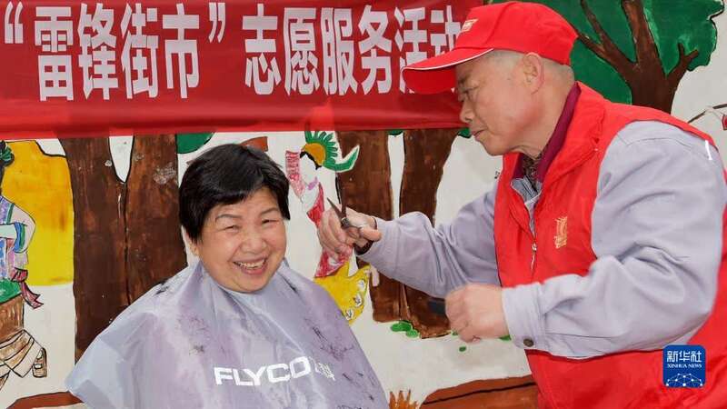 3月5日,志愿者在“雷锋街市”给市民免费理发。