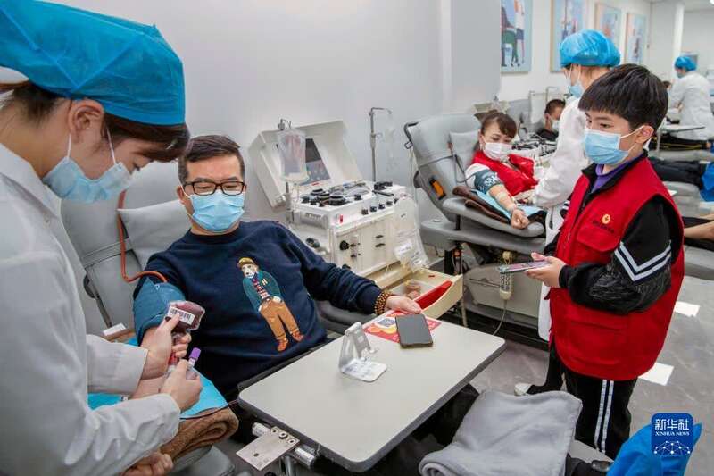 3月5日,一名温州市民在学雷锋纪念日前来义务献血,他的儿子在旁边观看。