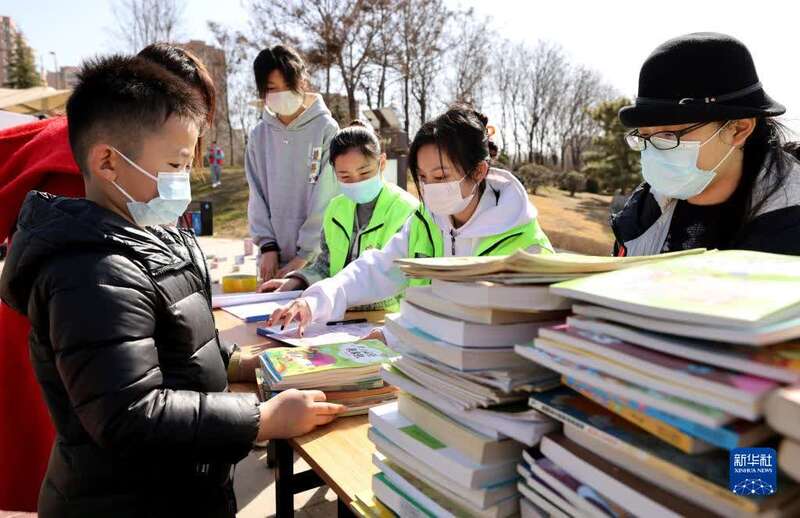 3月5日,一名小朋友在山东枣庄东湖公园的学雷锋献爱心活动上为留守儿童捐赠图书。