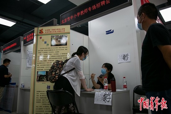 2021年8月27日,北京高校毕业生就业指导中心双选会大厅,2021年北京市中小学教师专场招聘会现场,一名手持简历的应聘者。据介绍,北京市逐步推进实行“双减”政策,市教委协调组织各区教委认真研制教师招聘工作方案,积极拓展招聘岗位,开展了新一轮的中小学教师公开招聘工作。 中青报·中青网记者 曲俊燕/摄