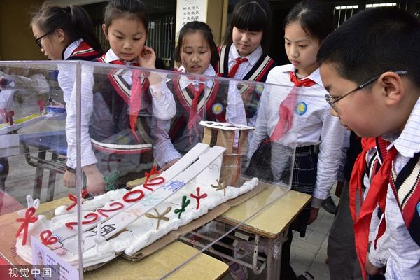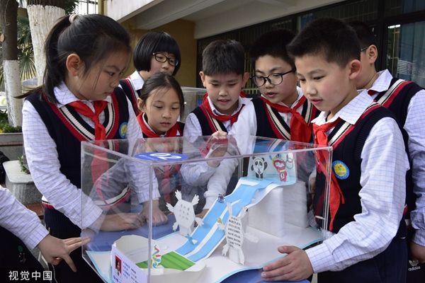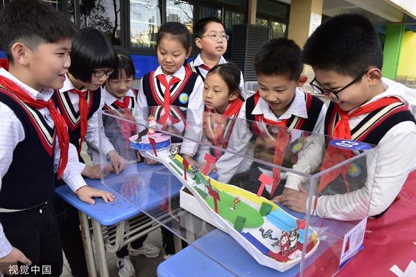 2022年3月7日,合肥市金湖小学举办“雪如意”跳台滑雪模型展,20多名小学生用矿泉水瓶、纸盒、木盒、废旧电线等废旧物品,制作出一件件构思巧妙、造型精美的“雪如意”跳台滑雪模型,助力冬残奥会。