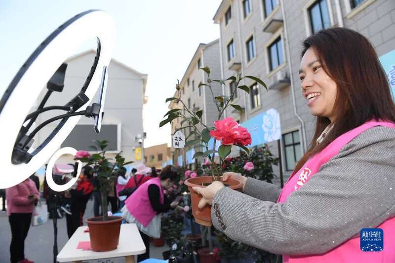 3月9日,在金华市举办的茶花节上,一名销售人员进行现场直播,助力茶花线上销售。新华社记者 翁忻旸 摄