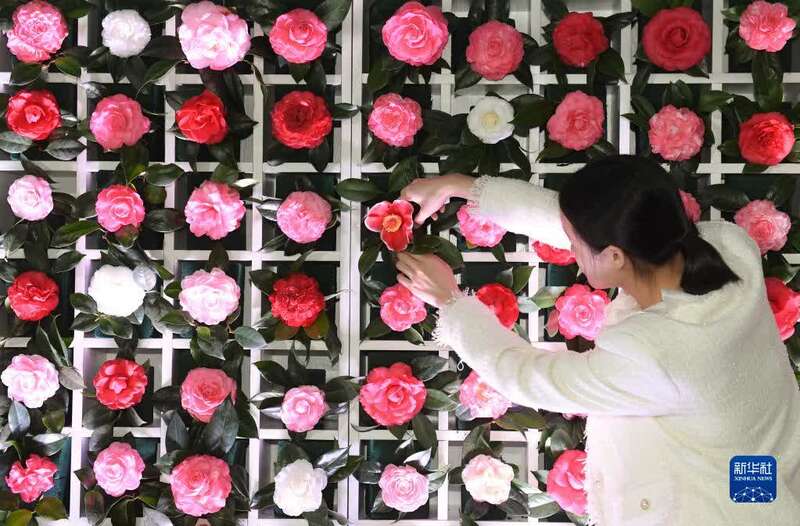 3月9日,在金华市婺城区竹马乡下张家村的一个展厅内,工作人员在整理展示的茶花。新华社记者 翁忻旸 摄