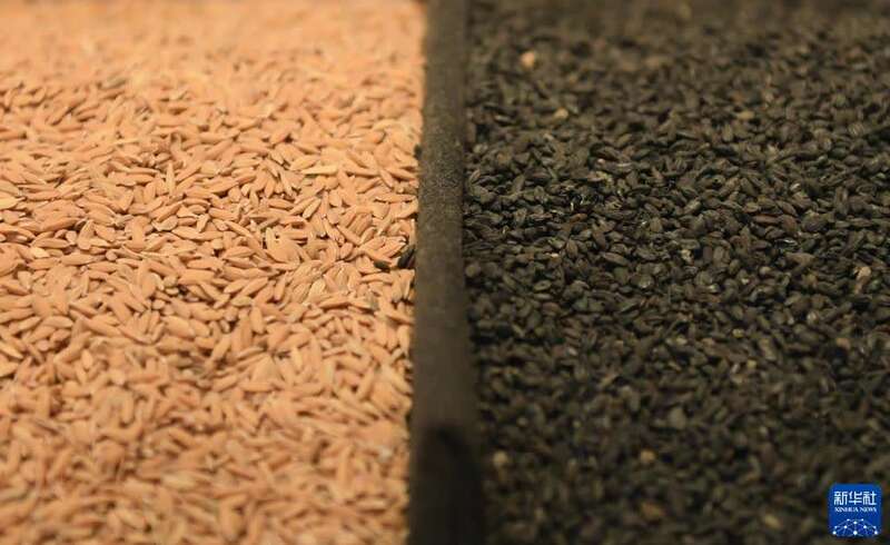 这是良渚博物院展示的现代稻谷和良渚遗址出土的炭化稻谷(右)的实物对比(3月2日摄)。