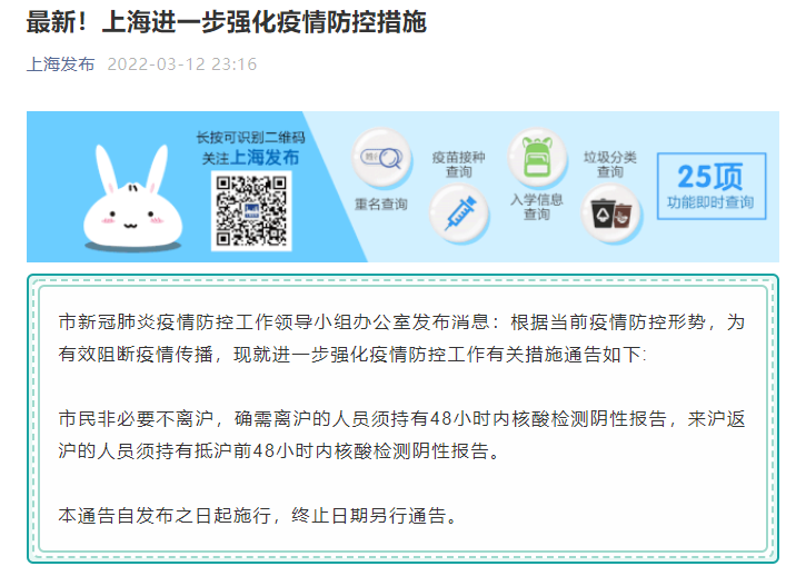 市民非必要不离沪,确需离沪的人员须持有48小时内核酸检测阴性报告,来沪返沪的人员须持有抵沪前48小时内核酸检测阴性报告。