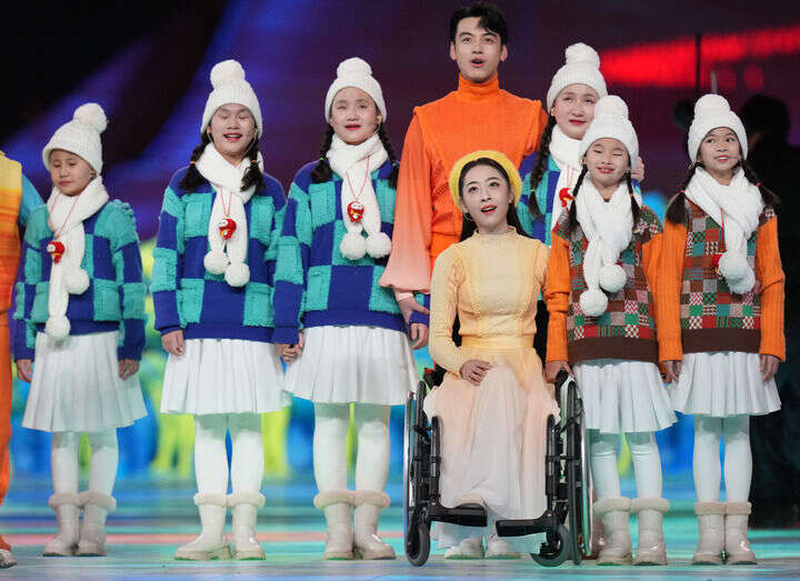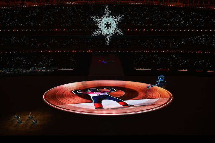 舒缓的音乐声中,表演者走上场地,将“唱针”拨向舞台中心方向。光影流转间,圆形舞台空间化作绚丽多彩的“留声机”,在《乘着歌声的翅膀》的悠扬旋律中,北京冬残奥会会徽出现在场地中央,开启属于全世界的欢聚时刻。