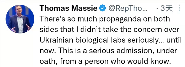 美国国会也对此愈发关切,议员们要求政府给出解释。众议员托马斯·马西在社交媒体上表示,对于各方围绕美国在乌生物实验室的口水仗,自己本来并不在意,但或许知道内情的副国务卿在国会参议院听证会上“严肃承认”乌克兰有生物研究设施还担心其落入俄手中,这让人不得不在意。