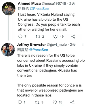 也有网友表示,纽兰刚承认乌克兰有生物实验室,你们政府官员说话前都不互相通气的吗。网友们追问,这些实验室是有什么不可告人的秘密,能让美国政府这么担心研究材料落入俄罗斯手里?