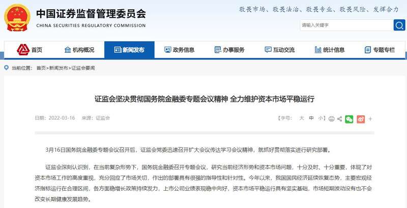 3月16日国务院金融委专题会议召开后,证监会党委迅速召开扩大会议传达学习会议精神,就抓好贯彻落实进行研究部署。