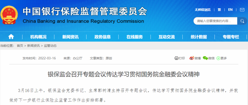 银保监会召开专题会议传达学习贯彻国务院金融委会议精神。会议指出,银保监会系统要深刻认识“两个确立”的重大意义,坚决做到“两个维护”,迅速把思想和行动统一到党中央对形势的分析判断和决策部署上来。要坚决落实中央经济工作会议精神和全国“两会”部署,担负起稳定宏观经济的责任,坚持发展是党执政兴国的第一要务,坚持以经济建设为中心,坚持深化改革、扩大开放,坚持市场化、法治化原则,坚持“两个毫不动摇”,切实保护产权,统筹疫情防控和经济社会发展,持续提高监管前瞻性有效性,深入推进银行业保险业改革开放,着力推动经济社会高质量发展,牢牢守住不发生系统性金融风险底线。