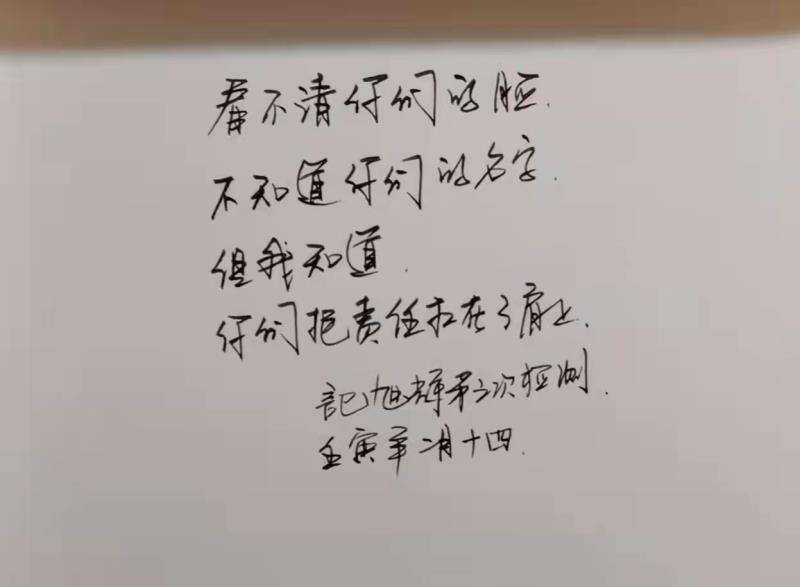 披荆斩“疾”,迎“疫”而上。光明府居委会筹建组在2天的闭环管理期间,正好小区负责人被隔离。年轻的社区干部黄家麒勇挑重担,按照负责人的指令,日夜坚守在居委会,和下派干部、物业公司、志愿者一起顺利完成小区核酸检测任务,连妻子产检都顾不上陪。