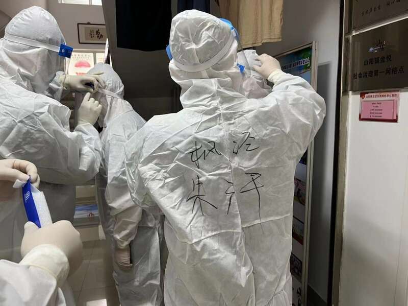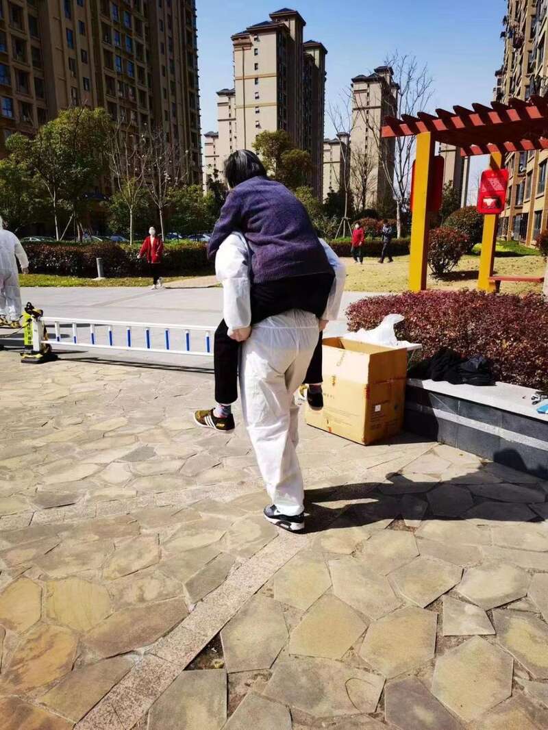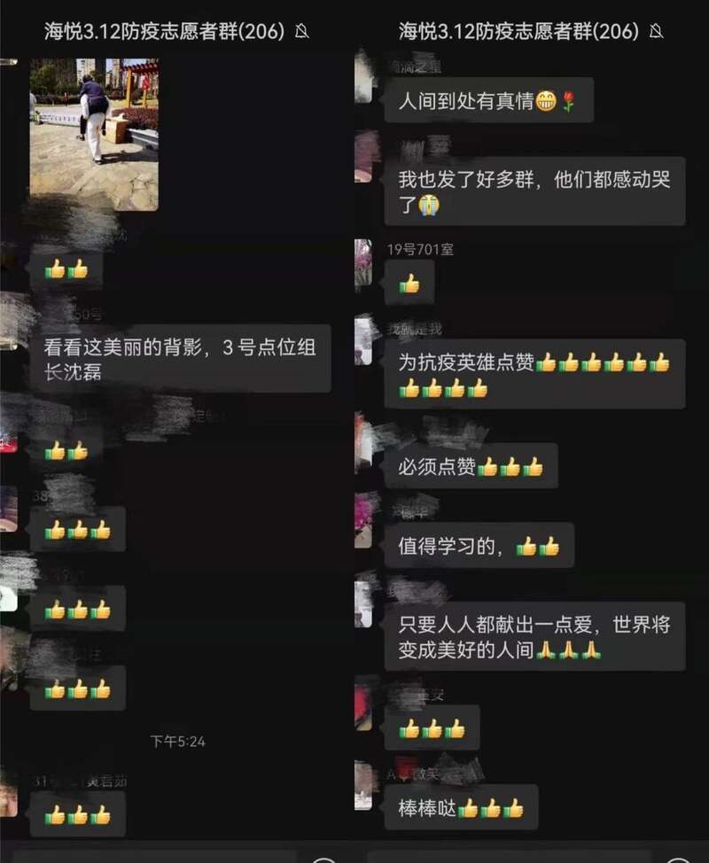 网友口中的沈磊,是山阳镇党群办的一名工作人员,也是镇党委派驻支援闭环管理小区、参与应急处置的127名志愿者之一。“采集3次背3次,虽然戴着口罩、穿着防护服,互相不认识,但是我们的心很近。”沈磊笑嘻嘻地说。原来,这位老人腿脚不便,但小区里轮椅用完了,为了帮医护人员“抢”时间,他便主动请缨把老人背下楼、再送上楼。
