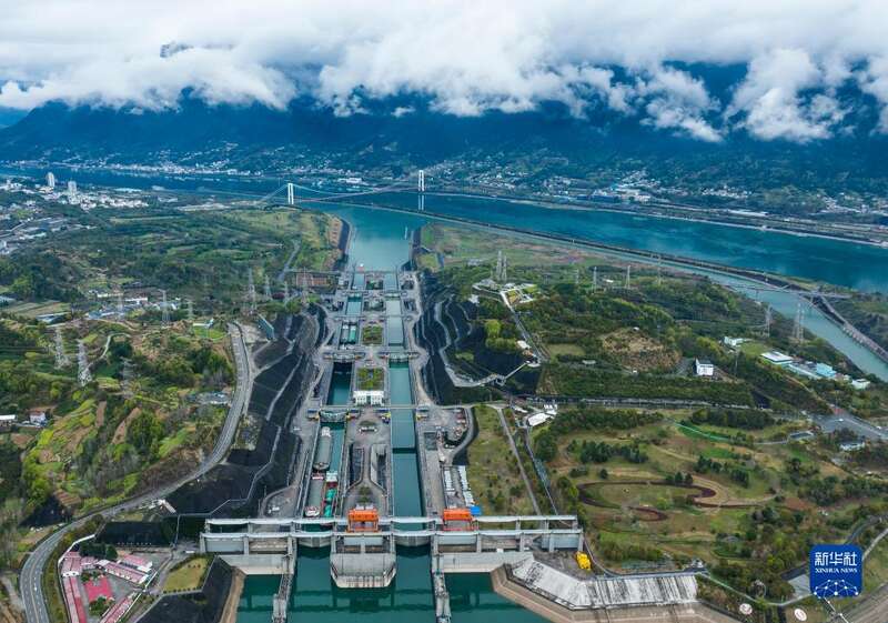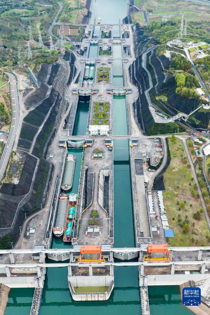 3月22日拍摄的三峡五级船闸,南线船闸已充水即将复航(无人机照片)。