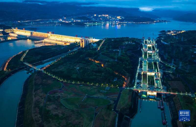 3月22日晚拍摄的三峡大坝和三峡五级船闸夜景(无人机照片)。