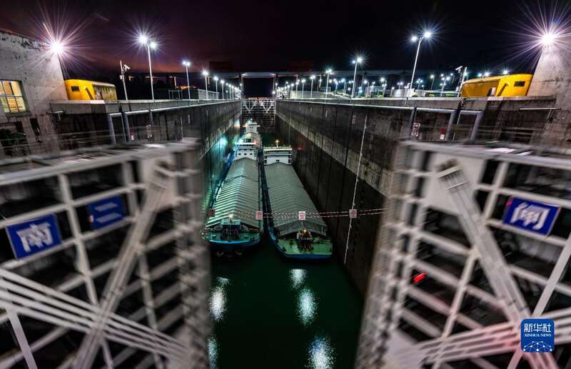 3月22日晚,船舶通过三峡南线船闸闸室下行。