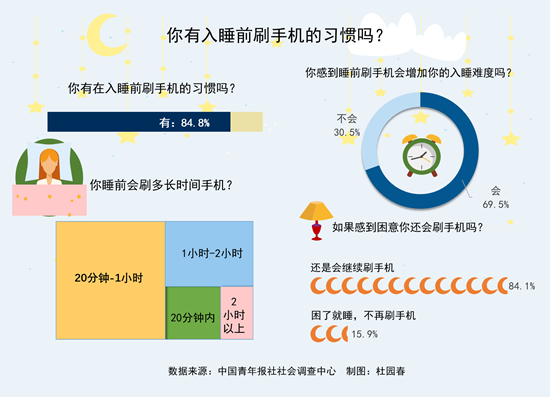 上周,中国青年报社社会调查中心联合问卷网(wenjuan.com),对1532名受访青年进行的一项调查显示,84.8%的受访青年都有睡前刷手机的习惯。即便感到困意,84.1%的受访青年还是会继续刷手机。69.5%的受访青年直言睡前刷手机会增加入睡难度。