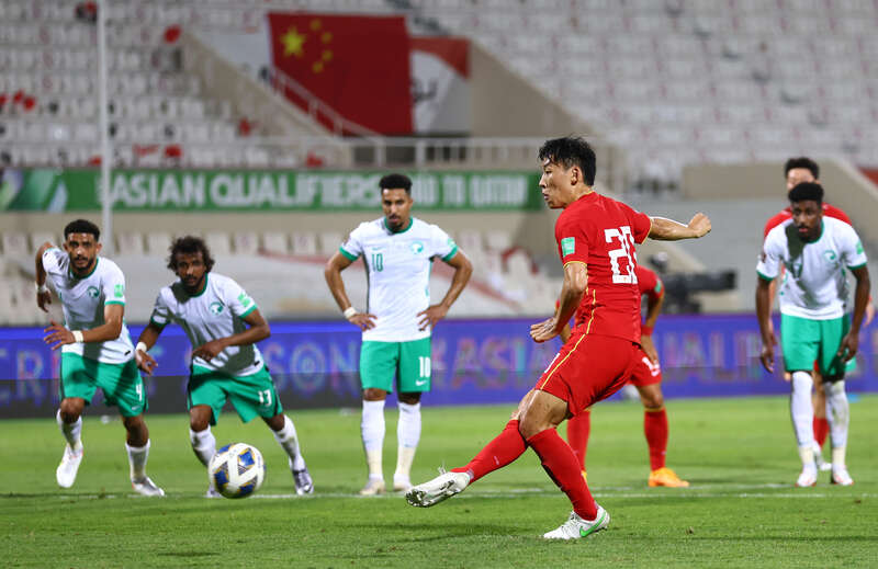 12强赛第9轮国足1:1战平沙特。图为朱辰杰点球帮助球队扳平比分。视觉中国供图