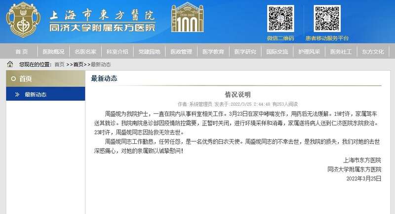 今晨,上海东方医院就昨日网传“护士哮喘发作得不到及时救治离世”发布情况说明。说明称:“周盛妮为我院护士,一直在院内从事科室相关工作。3月23日在家中哮喘发作,用药后无法缓解。19时许,家属驾车送其就诊。我院南院急诊部因疫情防控需要,正暂时关闭,进行环境采样和消毒,家属遂将病人送到仁济医院东院救治。23时许,周盛妮同志因抢救无效去世。周盛妮同志工作勤恳,任劳任怨,是一名优秀的白衣天使。周盛妮同志的不幸去世,是我院的损失,我们对她的去世深感痛心,对她的亲属致以诚挚慰问!”