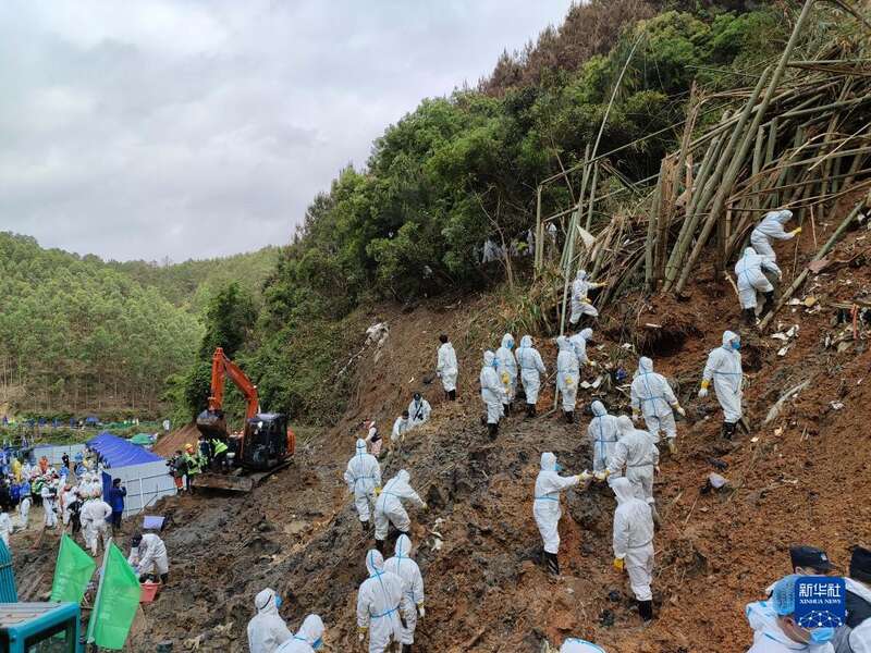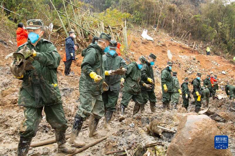 3月25日,在广西梧州藤县东航MU5735航班坠机事故现场核心区,武警广西总队官兵与搜救人员继续开展搜寻工作。