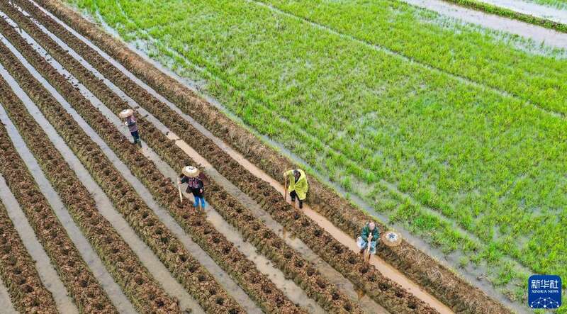 3月25日,在广西南宁市西乡塘区石埠街道老口村,农民在稻田间劳作。