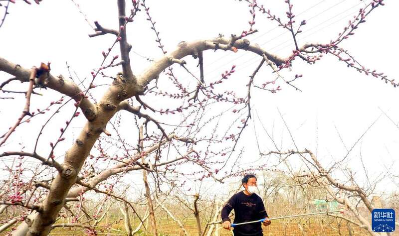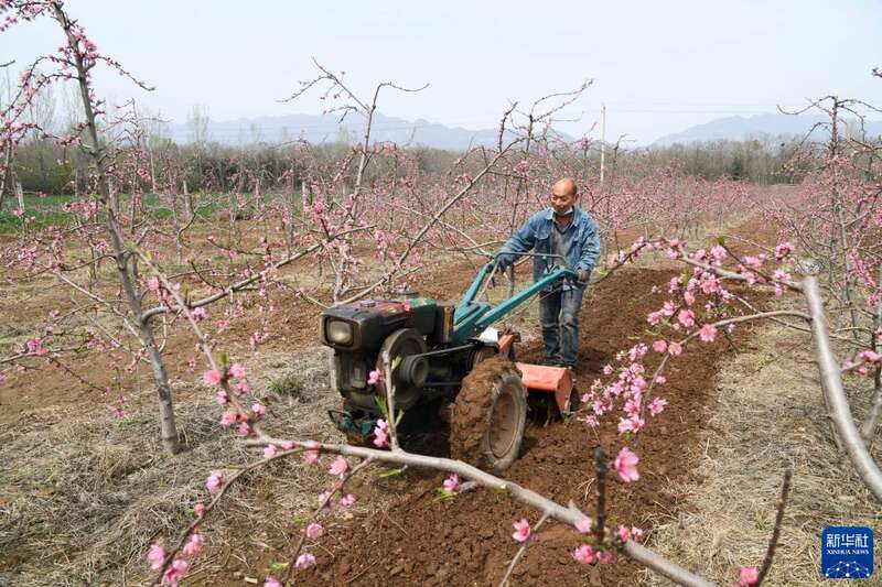 3月26日,河南省济源市克井镇勋掌新村农民在桃园耕作。