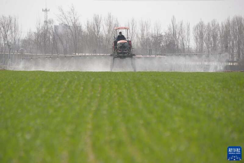 3月26日,在河北省保定市望都县寺庄镇寺庄村,植保人员驾驶植保机械在麦田里喷洒除草剂。