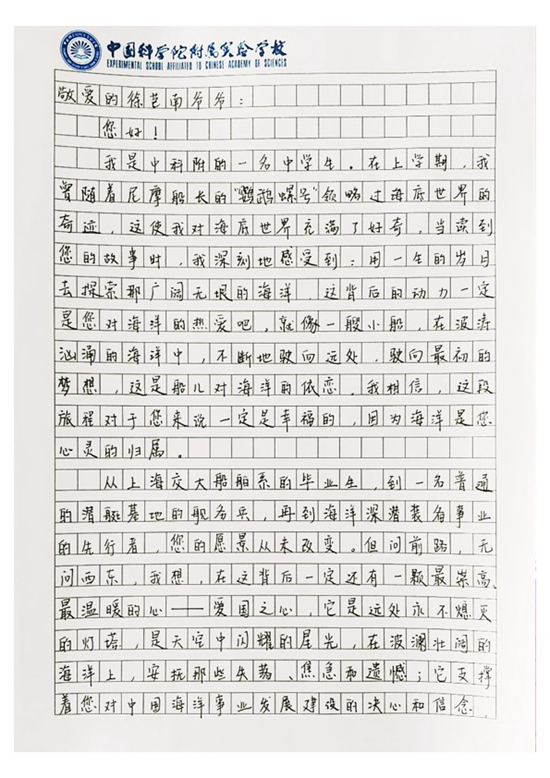在了解了“蛟龙号”总设计师、中国工程院院士徐芑南的故事后,中国科学院附属实验学校的学生刘子墨给院士写了信,刘子墨对“榜样”这样说:“读完您的故事,我深受鼓舞,那颗埋在我心中萌动的种子——对文学的热爱,如蛰伏一冬的小草,遇到春风,有了无限的力量……我想每一位文学家、民族英雄,他们与您一样,将自身的命运与国家命运联系在一起,为这项事业,为这个民族奉献着自己。或许每一种理想都是殊途同归,所以,在我今后的人生旅程上,我希望可以用文字向读者传达一种精神力量。”