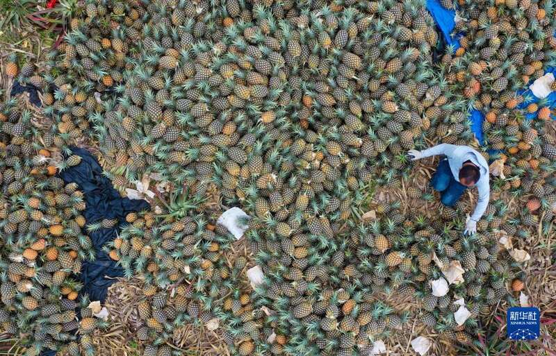 3月27日,工人在文昌市东阁镇田间分拣凤梨(无人机照片)。