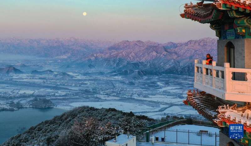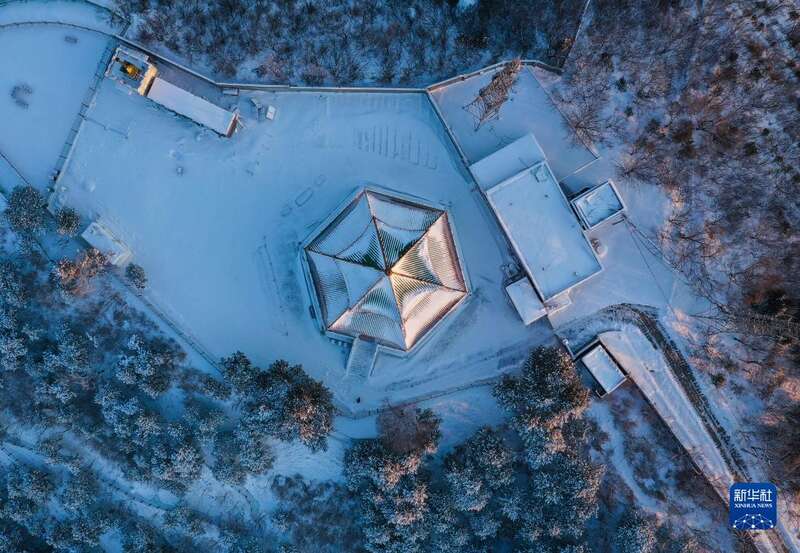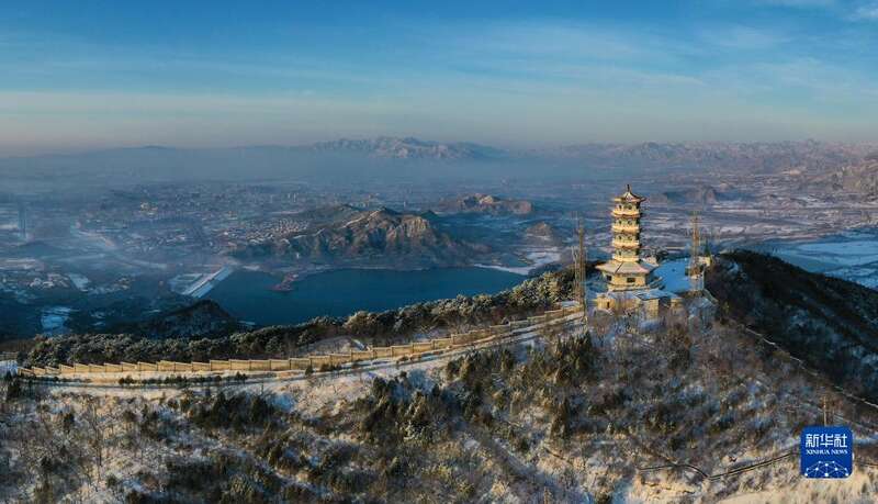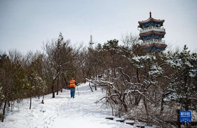 经过前一夜的风雪,北京市十三陵林场管理处蟒山瞭望塔布满积雪(3月19日摄,无人机照片)。