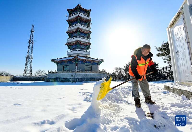 宋臣在瞭望塔外的院子中清理积雪(3月19日摄)。