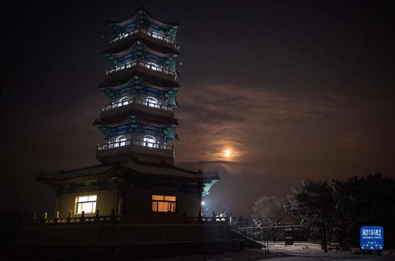 这是3月18日拍摄的夜色中的蟒山瞭望塔。