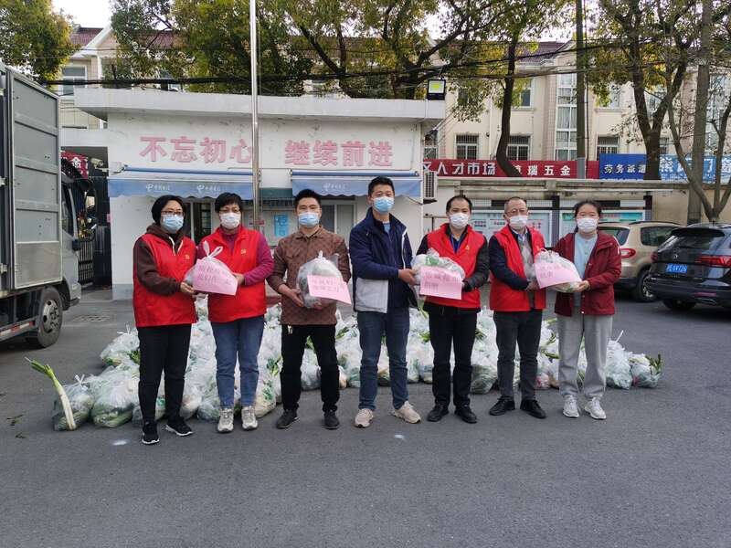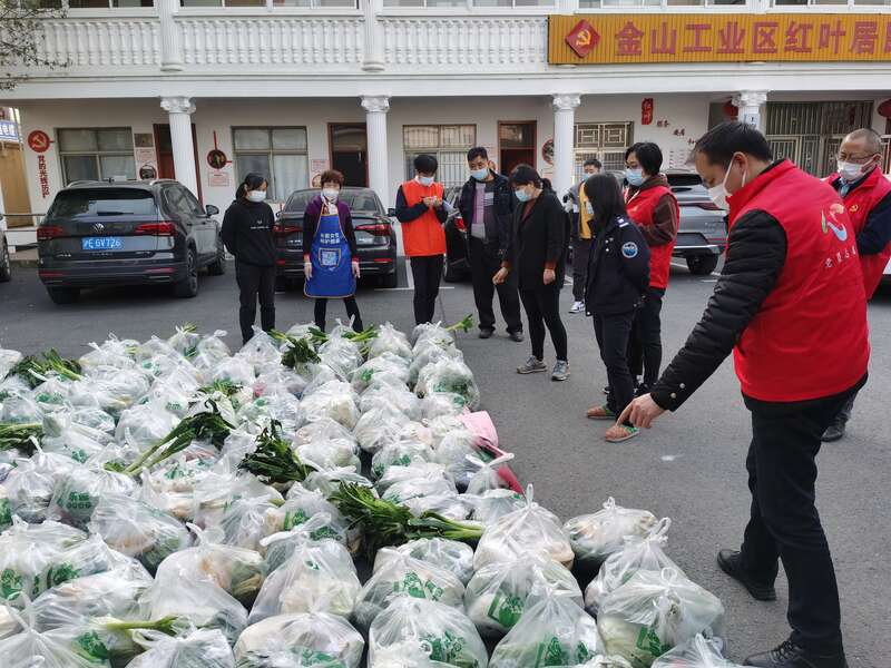3月29日下午,当金山区红叶居民区的志愿者们正在搭帐篷、打印二维码、招募志愿者,为封控后的第二次全员核酸检测忙碌准备时,传来几声汽车喇叭声响。乐诚超市的两位老板带着蔬菜来了!