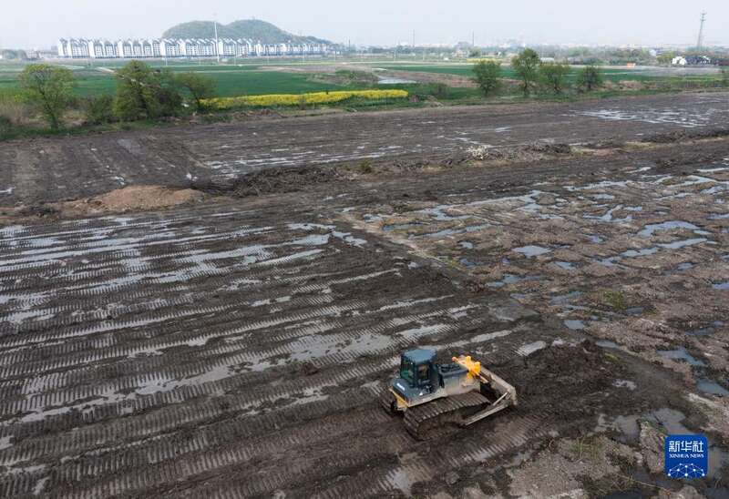 3月30日,推土机在湖州市吴兴区东林镇东华村一片进行“非粮化”整治的农田里平整土地(无人机照片)。