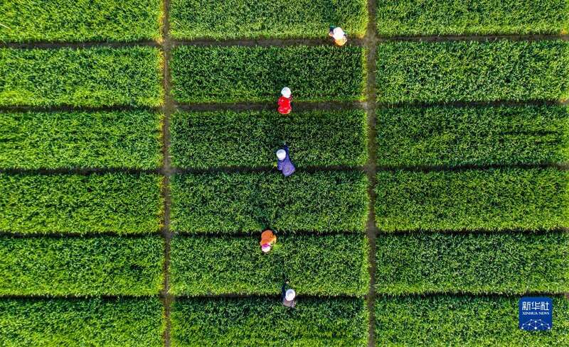 3月30日,在安徽省合肥市庐江县白湖镇省级现代农业示范区育种基地,农民在小麦育种田清除杂草(无人机照片)。